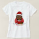 T-shirt féminin avec l'illustration d'une jolie fille noire souriante et souriante aux cheveux courts, elle porte un costume de Père Noël rouge et blanc et tient un cadeau; avec le texte modifiable modèle pour votre nom ou message, conception de vacances de Noël avec un arrière - plan rouge