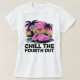 ce t-shirt aux couleurs claires est doté d'un flamant rose vif et vous invite à vous détendre dans une piscine d'eau. Les lunettes de soleil cool flamingo, au design américain, capturent à merveille une ambiance festive du 4 juillet. Des palmiers et un coucher de soleil coloré forment un décor tropical. Sous l'image, le texte "CHILL THE FOURTH OUT" est affiché en gras, en lettres noires. Montrez votre esprit patriotique avec ce tee amusant et estival !