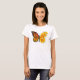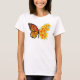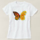 Orange, detailed monarch butterfly with wing decorated with yellow, vibrant California poppy on white background.