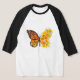 Orange, detailed monarch butterfly with wing decorated with yellow, vibrant California poppy on white background.