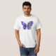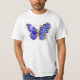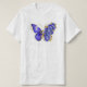 Jewelry, blue, sapphire, sparkling flower butterfly with wing decorated with blue, precious flowers with gold leaves on white background.