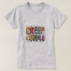 le mot T-shirt croustillant et croustillant est "CUDDLE". L'arrière - plan se compose de points multicolores ou de taches. La nature contrastée de ces mots (connotations négatives avec "fluage" et chaleur associée à "câlinage") crée une juxtaposition intrigante.