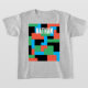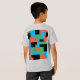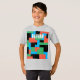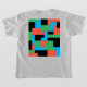 Un T-shirt abstrait moderne aux motifs de formes géométriques imbriquées en rouge, vert, noir et orange. La motif géométrique colorée a une apparence de jeu d'ordinateur, idéal pour les joueurs et les amateurs de technologie. Personnalisez avec un nom en majuscules blanches en lettres près du haut du design.