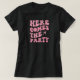 Mignonne et drôle Bachelorette T Chemise pour les amis de la mariée. Texte simple qui dit Voici vient la fête avec des lettres roses et des verres à vin rose.