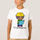 Pour l'ingénieur en formation. Garçon aux cheveux violets dans un chapeau jaune dur aux plans bleus. Avec les mots "Future Engineer".
