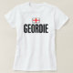 Ce T-shirt montre le drapeau anglais de St George en rouge et le blanc patriotiques, avec le mot "GEORDIE" écrit dans le lettrage audacieux noir.