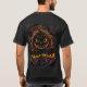 Le t-shirt de l'image est décoré sur le thème de l'Halloween et présente l'image centrale d'un citrouille orange au visage menaçant, entouré de deux crânes, de toiles d'araignée, de chauves-souris et d'une pleine lune avec une silhouette de chauve-souris supplémentaire. Le mot "HALLOWEEN" est affiché en bas en gras et stylisé.