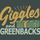 Deux mots principaux : "Giggles" écrit dans une police ludique et légère, peut-être avec une légère courbe ou rebondir aux lettres. "GREENBACKS" écrit dans une police audacieuse, peut-être d'un dollar, avec une couleur verte qui met l'accent sur le lien avec l'argent.
