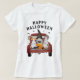 Célébrez la saison d'Halloween avec ce t-shirt mignon. Caractérisé par une illustration aquarelle d'un vieux pick-up rouge avec trois gnomes à l'arrière ainsi que des citrouilles et un chat noir. Des chauves-souris en vol complètent la scène d'automne Halloween. Au-dessus, la citation Joyeux Halloween est écrite en typographie noire.
