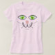 Ce modèle de T-shirt féminin présente un dessin coloré d'un joli visage de chat aux yeux verts et souriants, avec des chuchotements et un nez rose.