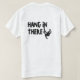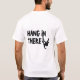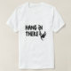 Conception motivationnelle joueuse avec un singe suspendu au texte qui dit "Hang in There". Parfait pour ajouter une touche d'humour et d'inspiration à votre journée. La police de caractères gras et dessinée à la main et l'illustration simple en noir et blanc rendent cette conception attrayante et polyvalente pour divers produits.