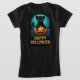 Cute black panther kitten perched on a bright orange pumpkin with teal leaves above bold leopard-print “Happy Halloween” lettering. Playful, festive and whimsical artwork ideal for seasonal cards and decor.