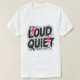 Le T-shirt 'Chaotic Harmony' présente une interaction dynamique entre les mots 'LOUD' et 'QUIET'**, tous deux rendus en grandes lettres noires mouchetées. Des éclairs roses éclairs tranchent les mots, mettant l'accent sur la tension entre le bruit et le silence. L'arrière - plan est un mélange chaotique de texte en forme de graffiti dans différentes polices de caractères et nuances de gris, créant une pièce stimulante visuellement et stimulante.