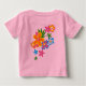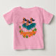 Caricature adorable de trois hula filles dansant entourée d'un lei floral.Ce dessin est également disponible dans une autre couleur. Cette caricature originale orne ces t-shirts en bas âge sur le devant avec un imprimé d'accompagnement d'un amas de fleurs sur le dos. Ces dessins sont présentés dans plusieurs coloris.