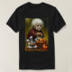 Une vieille dame fantomatique tient un citrouille, tandis qu'un squelette prend un bain dans une tasse de thé à côté d'un jack-o'lanterne sculpté. La scène de table avec des feuilles d'automne dispersée autour. Photoshop Art numérique CS6