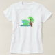 un hippo de dessin animé d'une patte verte dans l'eau. Palmiers dans l'arrière - plan.