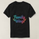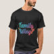 Le t-shirt comporte le texte "ailes familiales" écrit en plusieurs couleurs, vibrantes, avec un arrière - plan flou.
