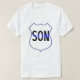 Cette chemise comporte un bouclier bleu autour du mot "Fils" qui a une fine ligne bleue à travers elle pour faire savoir au monde que vous soutenez votre parent.