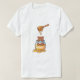 A sweet little brown bear peeks out from a glass honey jar, sitting cozily in a pool of golden honey with tiny paw pads showing. Above, a wooden honey dipper drips glossy honey in thick, shiny strands, creating a warm, candy-like look. Bold outlines, smooth highlights, and the big “HONEY” label give the illustration a bright, playful kawaii sticker style.