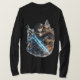 A fierce fantasy print featuring a dynamic, ice-cobalt warrior wielding a glowing blue lightning sword; frosted effects, fiery embers, bold contrast for anime/gaming apparel.