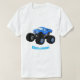 Ce mignon camion monstre bleu est prêt pour l'action de course. Camionneur de course haute octane amusant dessiné dans le style de dessin animé heureux!