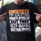 L'Ingénieur Drôle Dit "Ingénieur, J'Essaie De Faire Des Choses Une Preuve Idiot Mais Ils Continuent À Faire De Meilleurs Idiots". Prenez ce dessin de Funny Engineer comme un cadeau amusant pour une maman, un père ou un ami génial.
