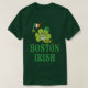 Caractéristiques de conception du jour de ce St Patrick un shamrock mignon de bande dessinée portant un Derby vert et ondulant un drapeau irlandais et la légende "Irlandais de Boston" en grand texte vert.