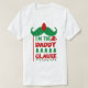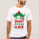 Ce t-shirt blanc présente un design de Noël ludique. Une grande moustache verte avec un nez rouge est en haut, suivie par le texte "IM THE" et "DADDY CLAUSE" en lettres rouges festives. Un petit chapeau de Père Noël surplombe "DADDY", des arbres de Noël verts et une série de lumières colorées complètent le design, créant un thème de vacances humoristique pour une figure paternelle.