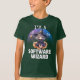 Cette image présente une sorcière de dessin animé avec un casquette violet et une robe noire, assise sur un tas de feuilles et tenant un balai. Elle a de longs cheveux bleu clair et de grands yeux bruns. L'arrière - plan est un dégradé bleu et violet semi-transparent avec un motif de code binaire. Le texte "I'M A SOFTWARE WIZARD" apparaît sous la sorcière. L'image suggère un point de vue ludique et humoristique sur l'idée d'un développeur de logiciels comme une figure magique. L'arrière - plan de code binaire renforce encore cette connexion au monde numérique. L'esthétique générale est fantaisiste et ludique, avec une touche de fantaisie.