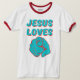 Ce t-shirt homme de ringard a une main bleue avec un doigt de pointage et un contour d'ombre rouge affichant les mots "Jésus aime" dans une police en caractères gras avec ombre assortie dans le thème de la citation basée sur la foi. Ce tee est d'inspiration vintage, avec des menottes contrastées et un décolleté pour un look sportif mais décontracté.