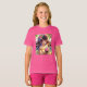 Anime fille avec de longs cheveux bruns, fleurs dans ses cheveux, une chemise d'anniversaire de cupcake rose et chocolat.