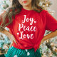 Women's Joy Peace and Love élégant tee - shirt graphique de vacances dans un script moderne blanc brossé avec de mignons accents de coeur. La couleur rouge des t-shirts peut être customisée.