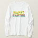 Joyeuses Pâques. Une salutation gaie et mignonne de Pâques sur une chemise attrayante. Le mot heureux est en jaune gai lumineux, et le mot Pâques est dans un arc-en-ciel de couleur. Tous les deux sont arrosés avec des fleurs. Vous pouvez changer la couleur de chemise et ou le style, si vous aimez. Voulez ceci ou une conception semblable sur un autre article ? Visitez mon magasin de Sensato.