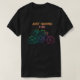 Ce t-shirt noir présente le texte "JUST HAVING FUN" dans un dégradé orange et rose au-dessus d'une ligne stylisée et colorée dessin d'une personne qui roule sur une moto. La moto et le coureur sont représentés avec des lignes passant à travers des nuances de bleu, vert, jaune, orange et rose, suggérant le mouvement et l'énergie.