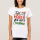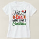 Ce t-shirt blanc présente le texte "Just A GIRL Who LOVES Christmas" dans un design festif. Le mot "FILLE" est en rouge avec un flocon de neige, et "Noël" est en écriture verte, orné d'hommes en pain d'épices, d'un chapeau de Père Noël, d'étoiles et de saints. Le design express un simple amour pour les vacances de Noël.