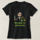 La conception de la justice climatique présente Lady Justice tenant des échelles contenant la Terre à une échelle et les gens à l'autre. Un graphique à points de discussion montrant la nécessité d'équilibrer les objectifs du changement climatique et l'égalité sociale avec l'équité et la force.