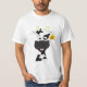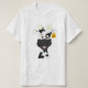 Sur la chemise de cet homme vous voyez une bande dessinée d'une tête de vache avec une marque. La vache regarde vraiment drôle et amicale avec son grand sourire.