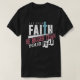 Ce t-shirt noir a un message inspirant. Le texte "LAISSEZ VOTRE FOI ÊTRE PLUS GRAND QUE VOTRE PEUR" est affiché dans un mélange de lettres blanches, turquoises et roses. Le "T" dans "FOI" est présenté comme un