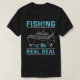 Ce design comporte un t-shirt noir avec le mot "FISHING" dans une police bleue stylisée en haut. En dessous, il y a une image d'un bateau de pêche. Sous le graphique du bateau est le texte "is the" ci-dessus "REAL DEAL.