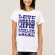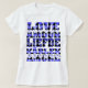 Aimez-vous les chemises à thème love ? Cette chemise dit amour en anglais, français, italien, néerlandais et suédois avec des coeurs dans différentes nuances de bleu.