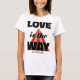 L'AMOUR est le CHEMIN, quelle belle déclaration d'amour pour votre t-shirt femme blanche. "LOVE" et "WAY" sont imprimés dans une police noire massive moderne, tandis que "is the" est écrit plus petit en italique. Sous le texte, la voie est suggérée par une route en perspective avec des rayures noires et or. En bas, vous trouverez un nom personnalisable écrit dans une police moderne en pointillés noirs. Remplacez le nom par défaut par celui de votre choix.