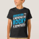 T-shirt sur le thème du hockey amusant avec un texte bleu et blanc sur un arrière - plan noir dit L'éducation est importante Mais le hockey est important!