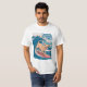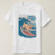 Labrador Retriever chien à bord d'une planche de surf au sommet d'une vague immense dans un cadre d'île tropicale.
