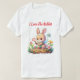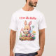 Un T-shirt blanc au design mignon, avec pour thème lapin et fleurs. Voici la description détaillée : Central print : Un joli lapin de dessin animé assis au milieu d'un lit de fleurs coloré. Le lapin a de grands yeux ronds, des joues roses et de longues oreilles dressées. Le corps est petit, portant un bib vert et a de petites ailes turquoise claires. Le lapin tient un petit coeur rose dans une main, créant une sensation douce et romantique. Paysage environnant : Le lapin est placé dans un cadre naturel frais avec de nombreux types de fleurs comme les marguerites, les lis et les plantes verts. Imprimer : Au-dessus de l'image du lapin se trouve la ligne "I Love The Rabbit", écrite dans une police molle et rouge, se détachant sur un arrière - plan de chemise blanche. Style chemise : T-shirt blanc clair, col rond, manches courtes. Ce design dégage une sensation douce, agréable et lumineuse, parfaite pour les amoureux des animaux ou ceux qui aiment un style jeune et mignon.