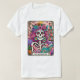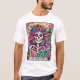 Design coloré et dynamique avec une carte tarot amusante avec un squelette féminin. Le squelette a des cheveux roses sauvages avec des fleurs dedans, un crâne de sucre, et tient un livre ouvert. Le texte coloré dit : "Le ver de bibliothèque". Ce design est disponible sur une grande variété de produits.