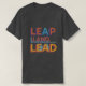 Le design du t-shirt comporte l'expression de motivation "Leap, Land, Lead" dans un design multicolore audacieux. Chaque mot est une couleur vibrante différente, créant un look dynamique et attrayant.