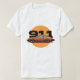 Un design de T-shirt rétro qui présente le profil côté élégant d'une voiture de sport classique, sur un fond de coucher de soleil circulaire avec des tons chauds de dégradé. Des lignes horizontales minces et une texture légèrement en difficulté rehaussent l'esthétique vintage, ce qui en fait l'idéal pour les amateurs de design automobile intemporel.