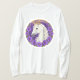 Cheval de course blanc avec couronne d'or et corne de licorne, entouré de fleurs mauves violettes.