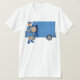 Cette conception est un livreur et un fourgon. Le fourgon de livraison est bleu et le livreur est debout dehors il portant une boîte pour la livraison. Cette conception de livreur et de fourgon semble grande