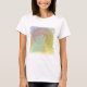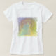 T-shirt avec loup hurlant à la lune. Détails de l'illustration : cadre ornemental à découpes, mandala floral et branche, fourrure couleur pierre de lune et couleurs jaune, vert, violet.